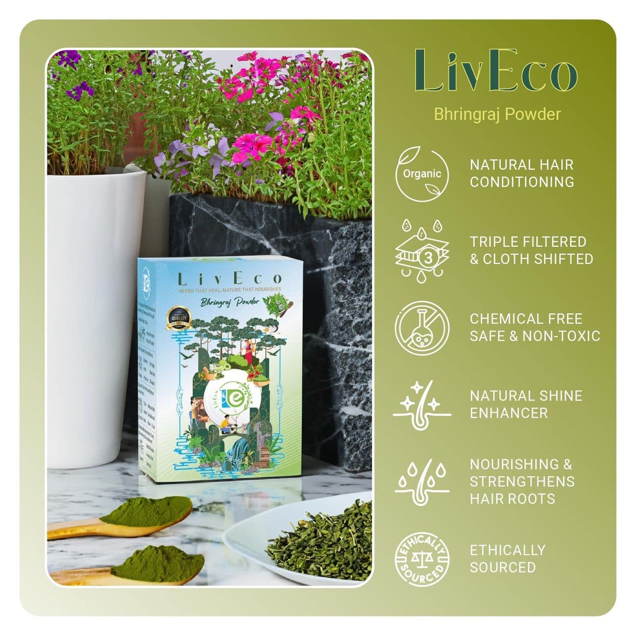 We understand the importance of authenticity when it comes to herbal remedies. Our Bhringraj Powder is sourced from the best Bhringraj plants, cultivated with care to ensure the highest quality. Through meticulous processing, we retain the herb’s natural potency, ensuring that you experience its full range of benefits. LivEco Bhringraj Powder invites you to tap into the age-old wisdom of Ayurveda and experience the majesty of Bhringraj. Revel in the beauty of strong, vibrant, and luxuriant hair, the way nature intended.