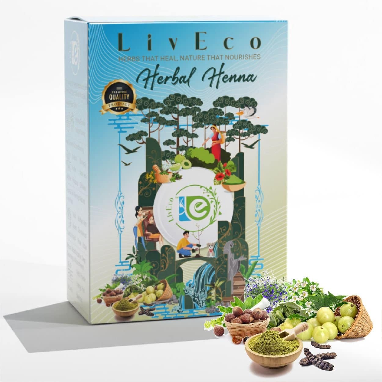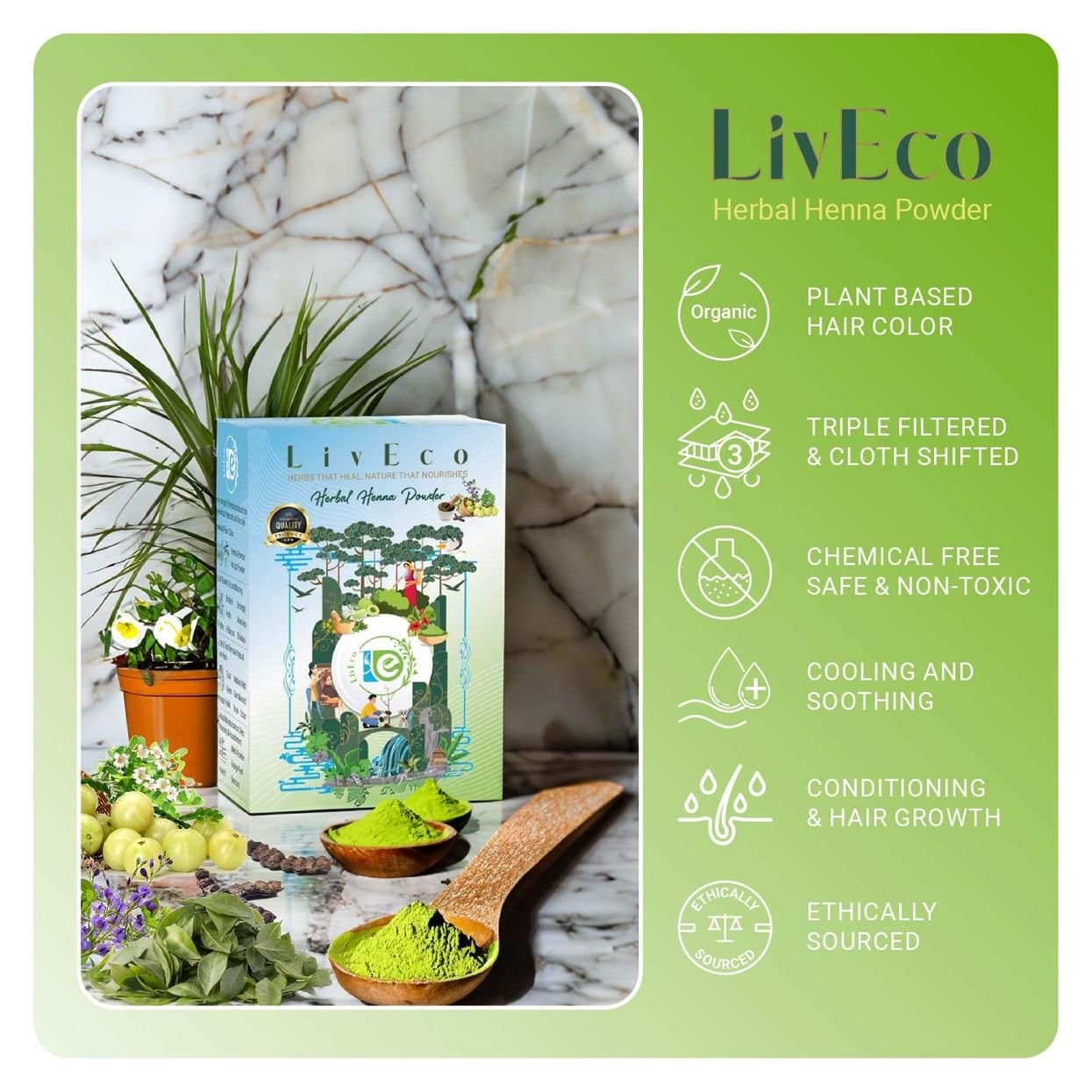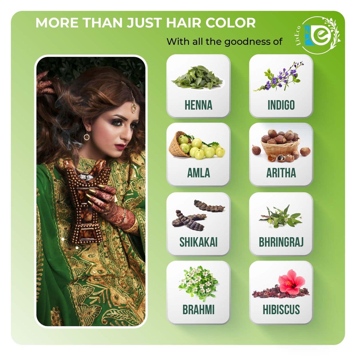 Chemical-free hair color with liveco 8 herbals mix herbal henna powder - featuring Amla, Bhringraj, Brahmi, Shikakai, Henna, Reetha, Aloe Vera, and Hibiscus for vibrant and healthy hair