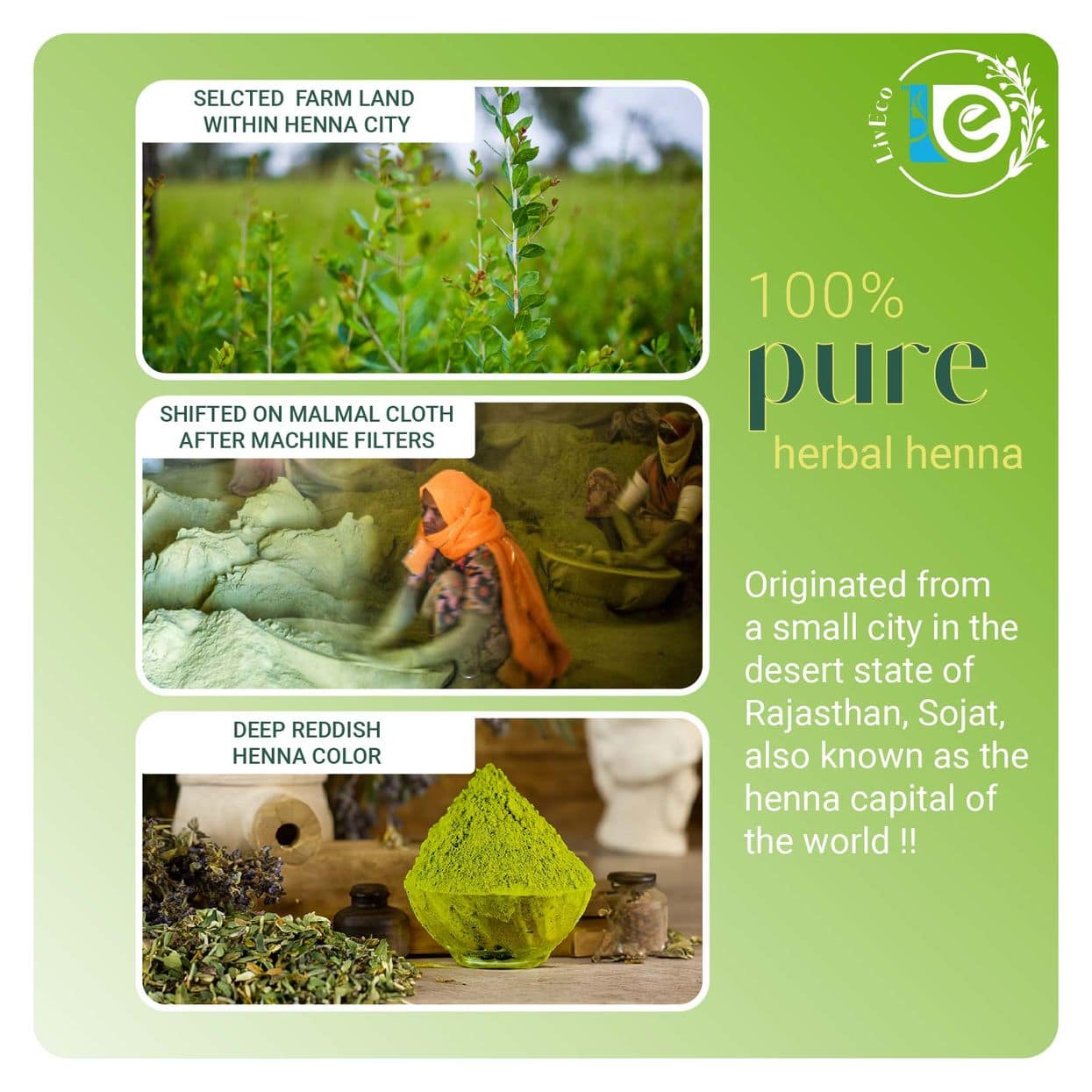 Experience the ancient tradition of henna with our premium quality Henna Powder. LivEco Herbal Henna Powder is Rajasthani mehandi powder made from the finest quality mehandi leaves sourced from the henna capital of the world, Sojat City, conferred with GI Tag by the Govt of India. This ancient city in the desert state of Rajasthan, India, is renowned for producing the world’s best mehndi due to its perfect climatic natural conditions, fertile soil, rainfed organic crop, and skilled artisans.