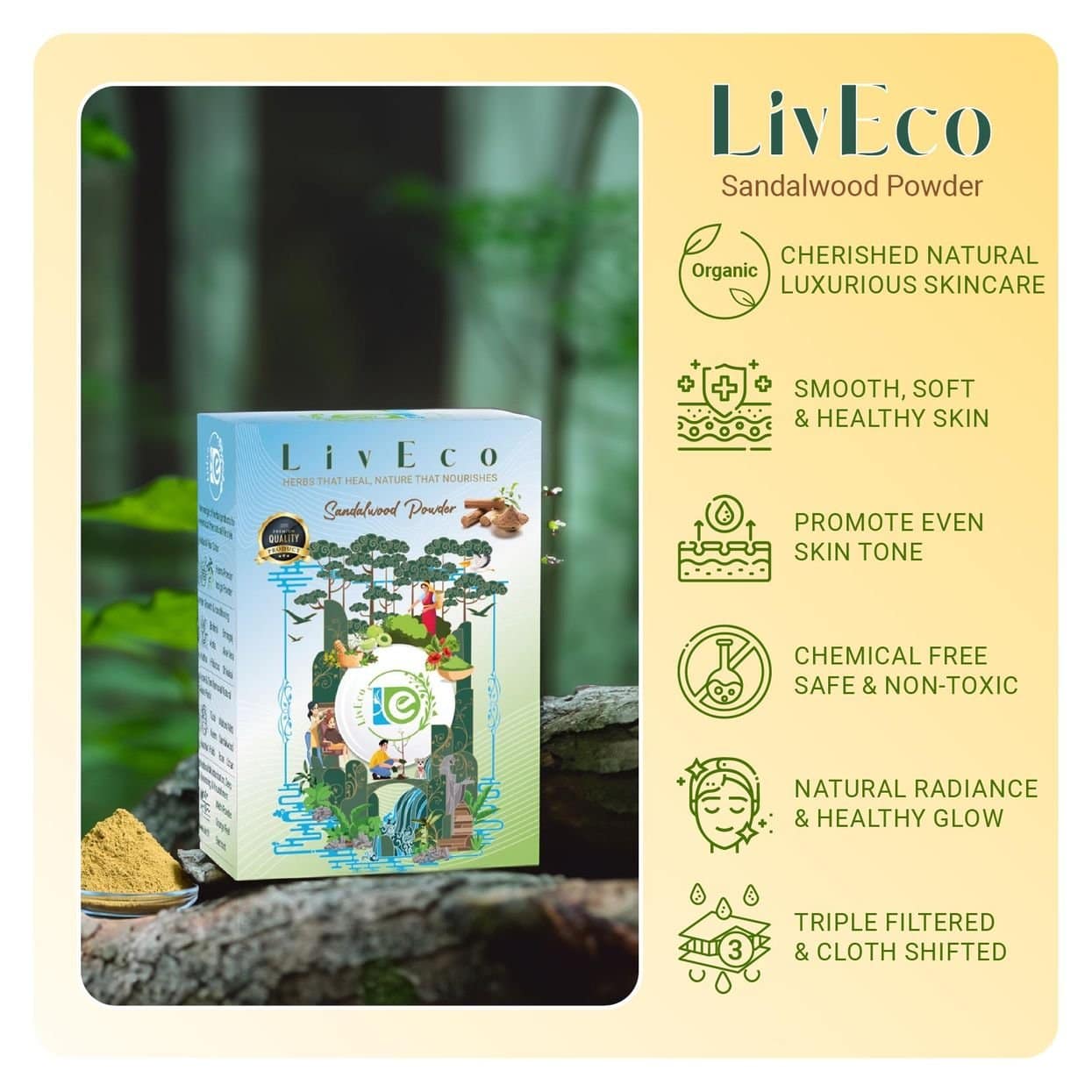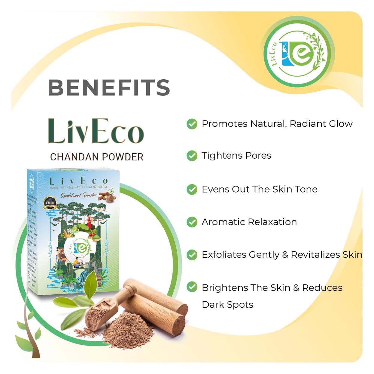 Experience the soothing and rejuvenating effects of LivEco Sandalwood Powder for a face pack, a luxurious addition to your skincare routine. This finely crafted powder captures the essence of Sandalwood, a cherished natural ingredient known for its remarkable properties. Incorporating this treasure into your skincare regimen offers a multitude of benefits.