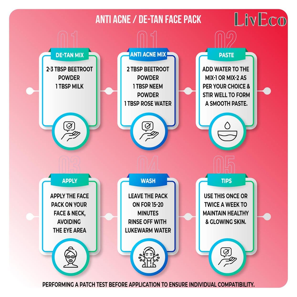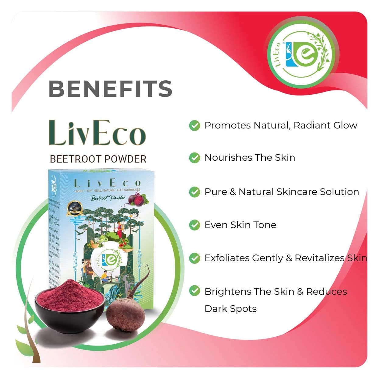 Versatile Beauty: The versatility of LivEco Beetroot Powder extends beyond traditional skincare. You can easily incorporate it into various beauty rituals. Create custom face masks, and scrubs, or add a pinch to your daily skincare routine. Its adaptability makes it a valuable addition to your beauty arsenal.