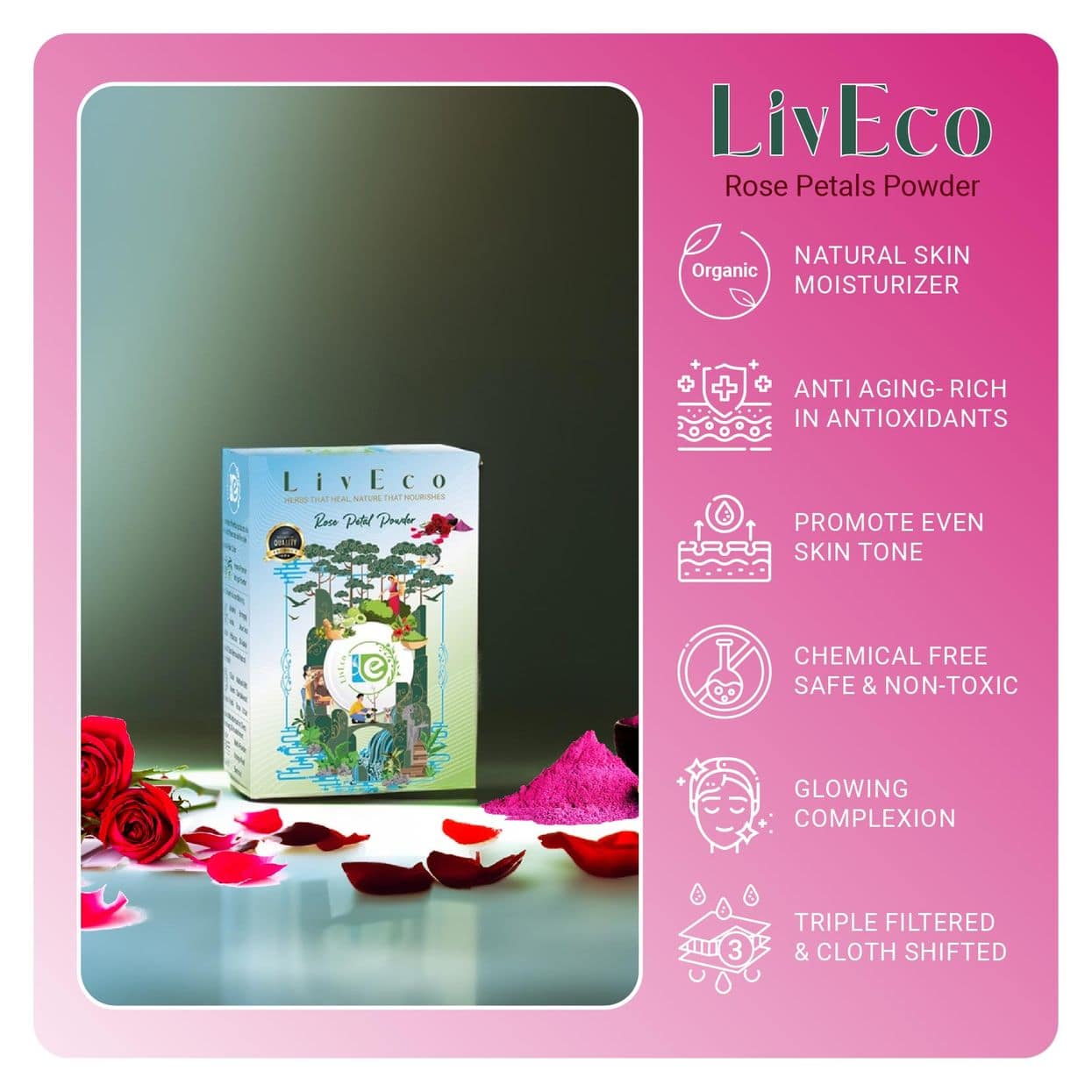 LivEco Rose Powder doesn’t just nurture your skin; it leaves it delicately scented. It’s akin to a subtle, natural perfume that accompanies you throughout the day, providing a fragrant touch to your skincare experience.