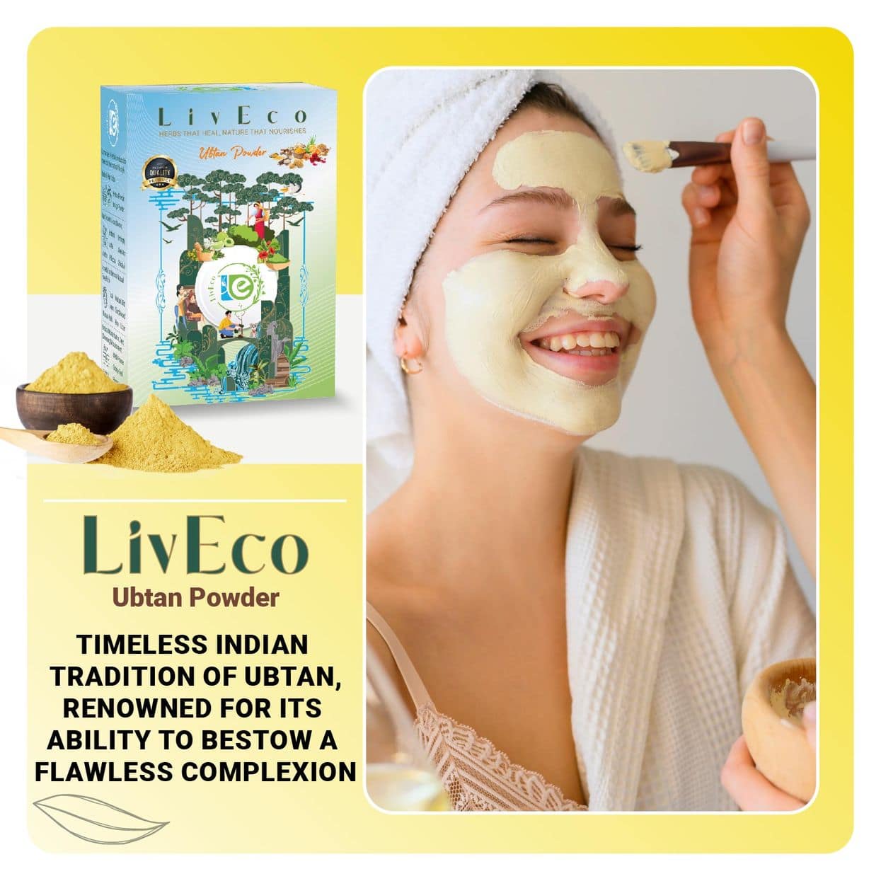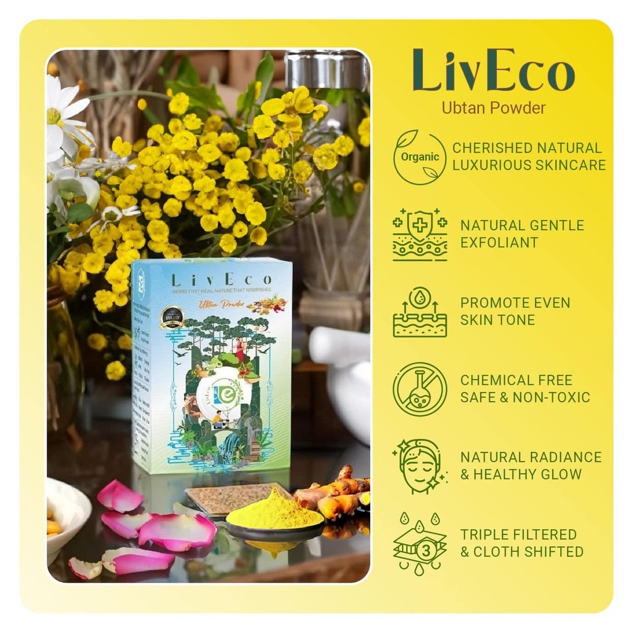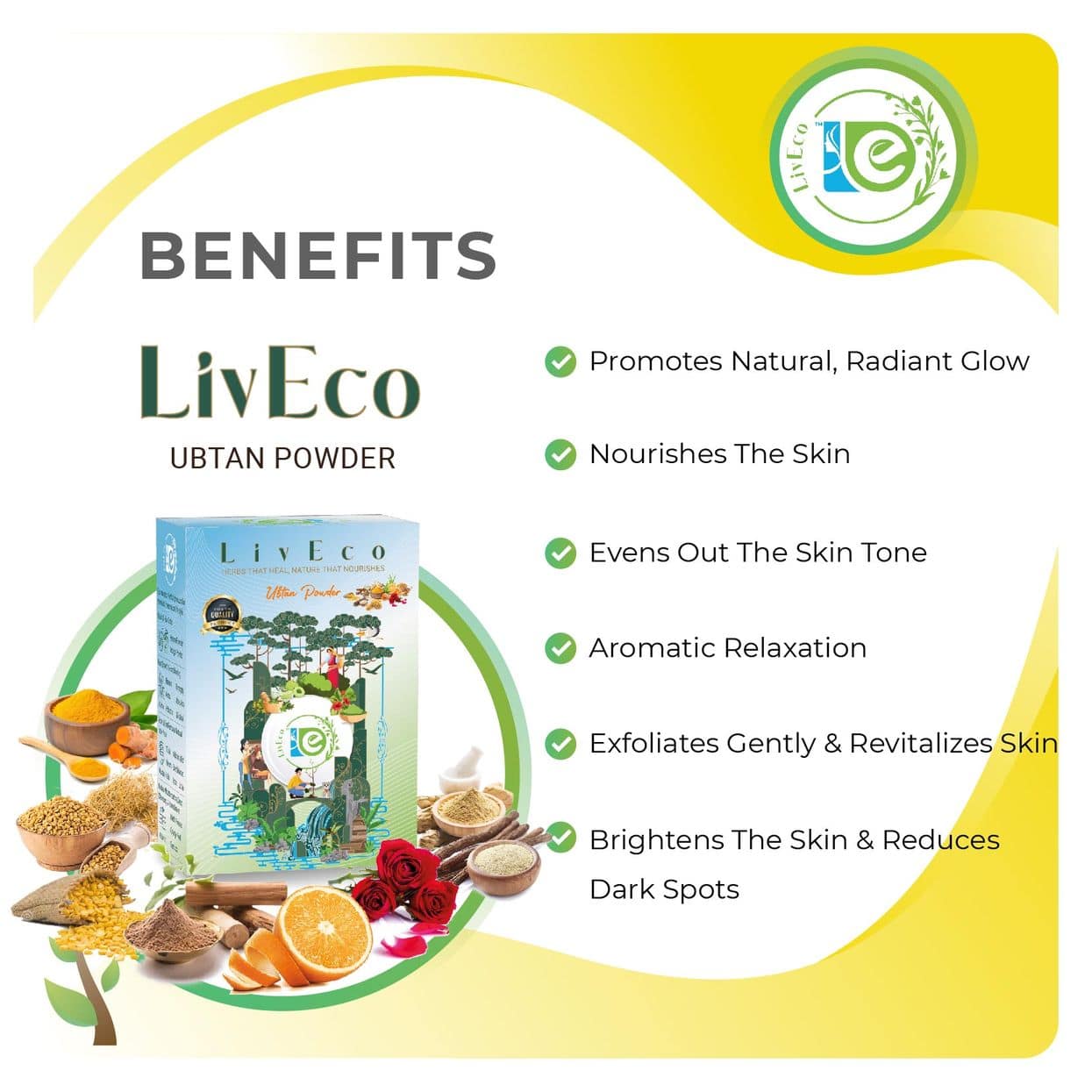 Pure Organic LivEco Ubtan Powder - natural skincare remedy for radiant, blemish-free skin. Brightens complexion, reduces acne, and fades dark spots.